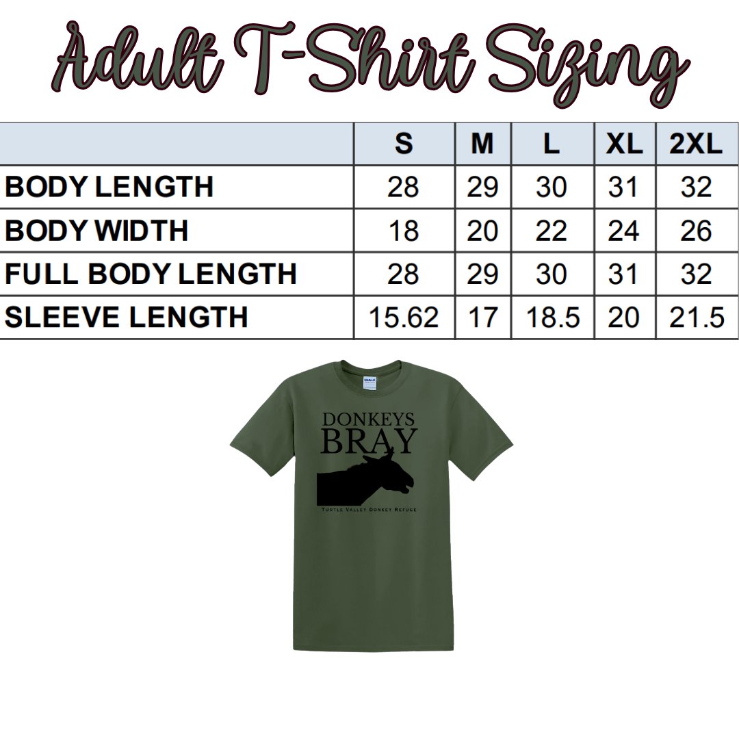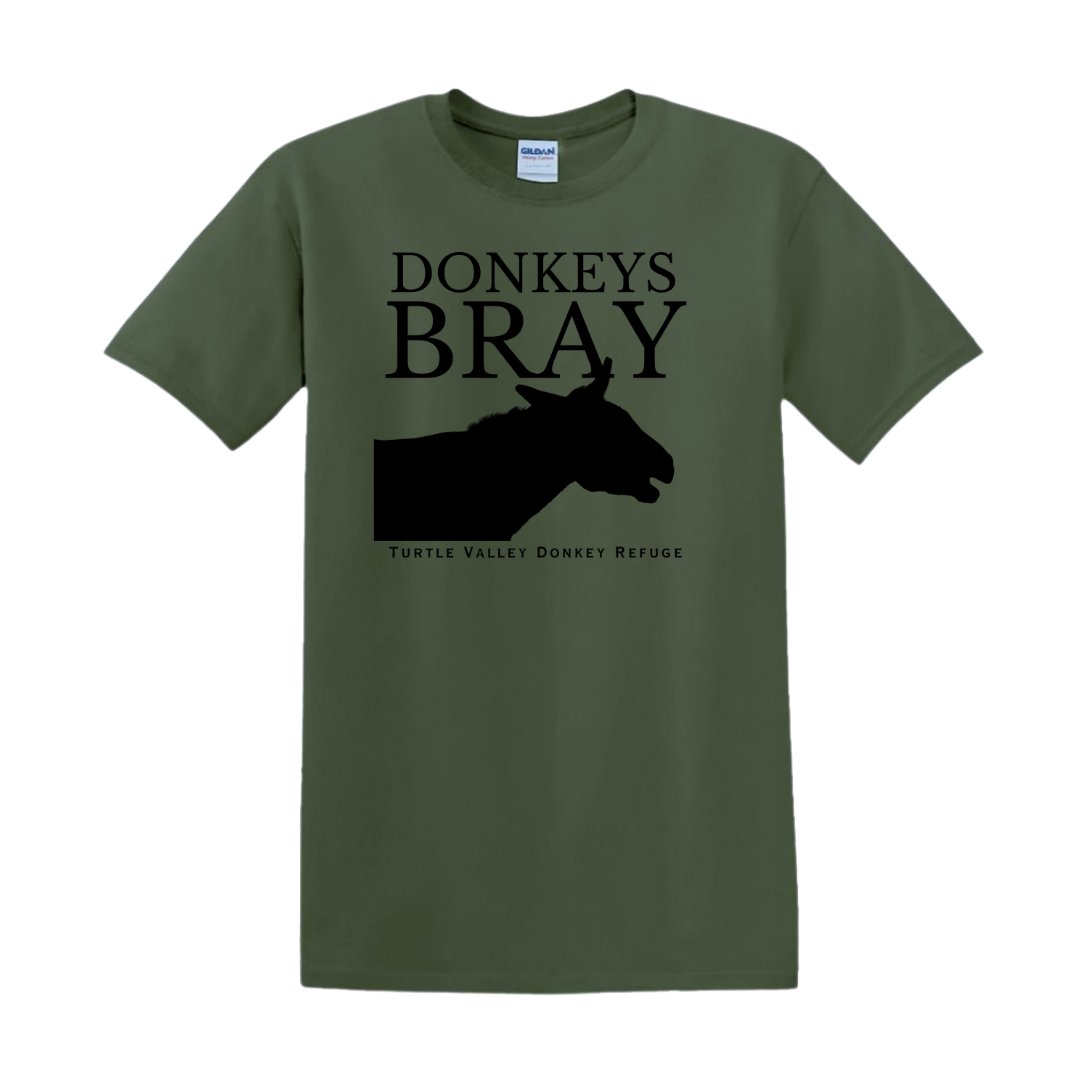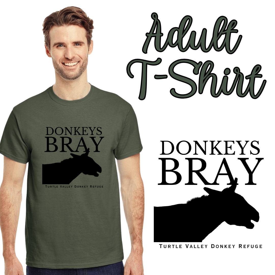 New this season - Donkeys Bray T-Shirts! Featuring a subtle military green colour available in adult sizes, these unisex tees are flattering on everyone. All proceeds of these shirts go directly to help us support the donkeys & their care.