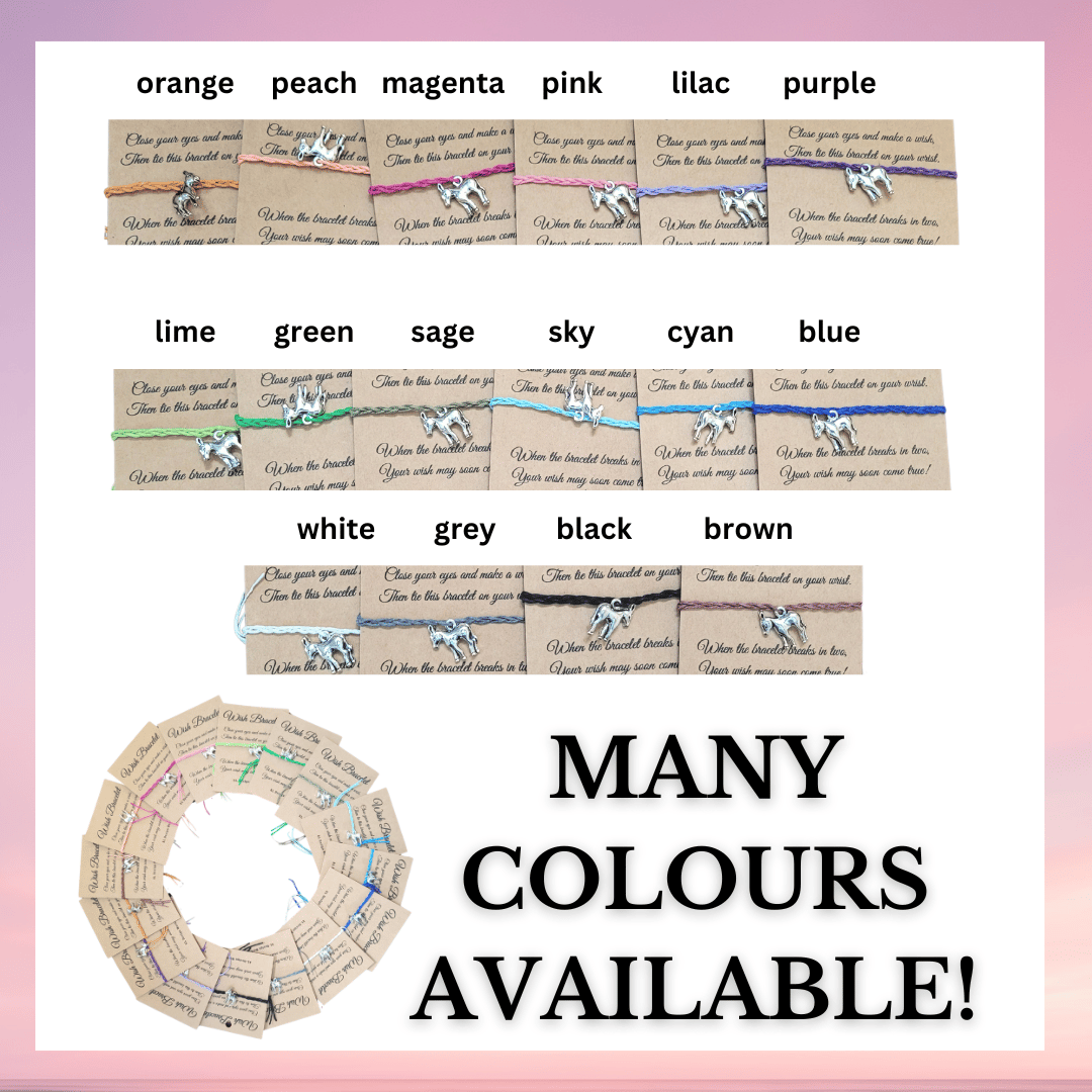 - Text on card reads: "Wish Bracelet - Close your eyes and make a wish, Then tie this bracelet on your wrist, When the bracelet breaks in two, Your wish may soon come true!"