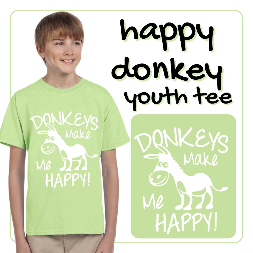- each tee is screen printed in white "Donkeys Make Me Happy" and features a cartoon donkey.