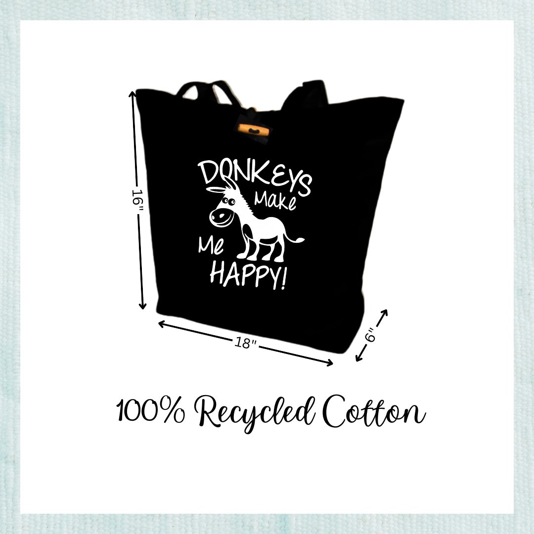 New this Season ~ now in stock! These recycled cotton super totes are perfect for everyday use. Grab some groceries, library books, or commute to yoga in style with our 'Donkeys Make Me Happy' graphic featuring an adorable cartoon donkey friend.