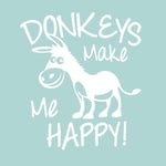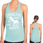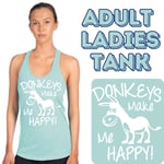 - each tank is screen printed in white "Donkeys Make Me Happy" and features a cartoon donkey.