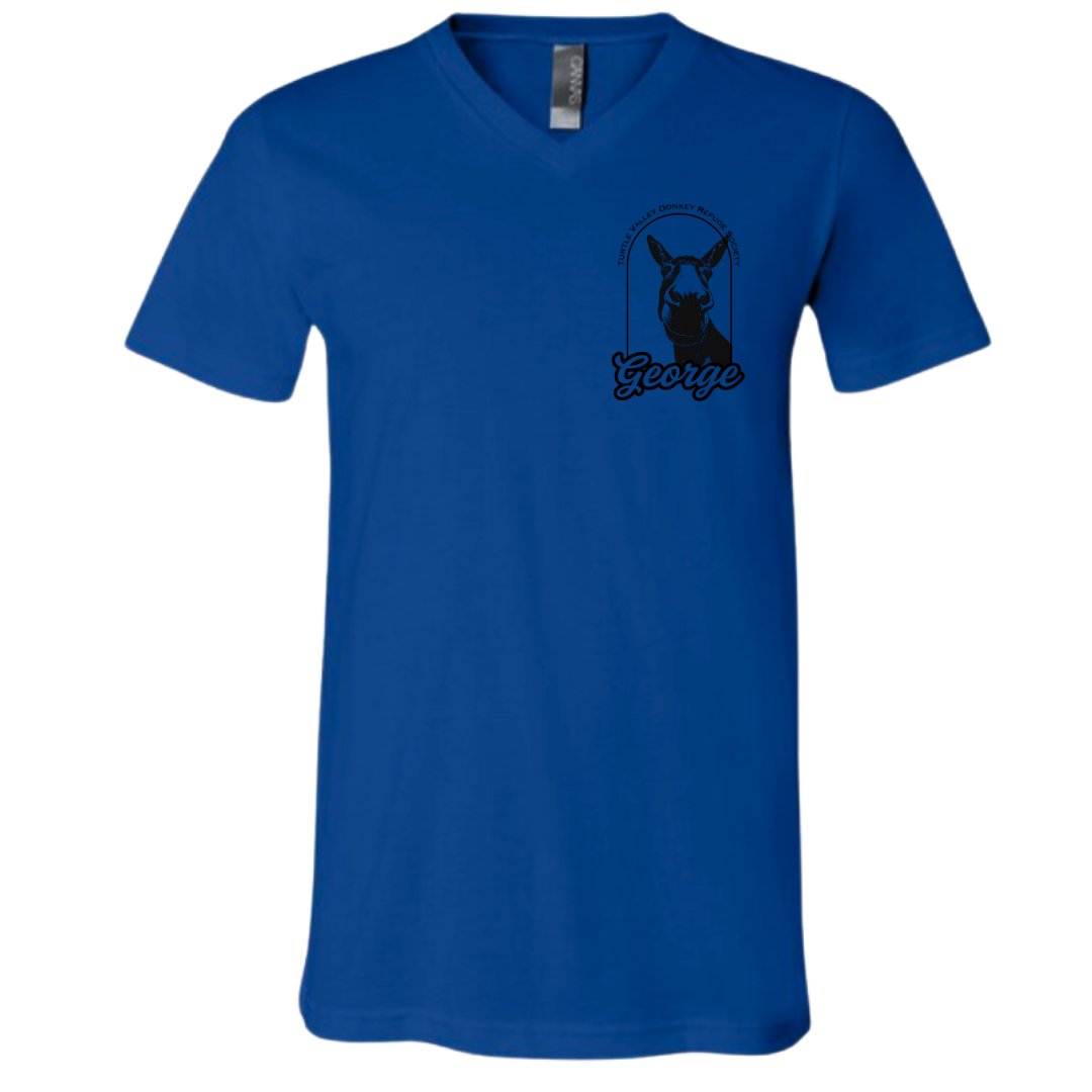 He's a bit of a problem child - but we still love him! New this summer - George gets his very own tee design. Shop now for your next favourite shirt: the Unisex Adult V-Neck Royal Blue T-Shirt featuring our boy George! Available in a soft Royal Blue colour available in adult sizes, these unisex v-neck tees are flattering on everyone. All proceeds of these shirts go directly to help us support the donkeys & their care.